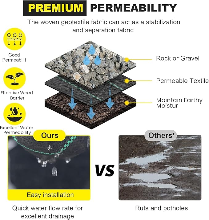 - 【Excellent Permeable Textile】- The woven geotextile fabric is highly permeable and breathable, without worries about water pooling. It is ideal for french drains, garden planting, and landscaping,to provide convenience on the driveways